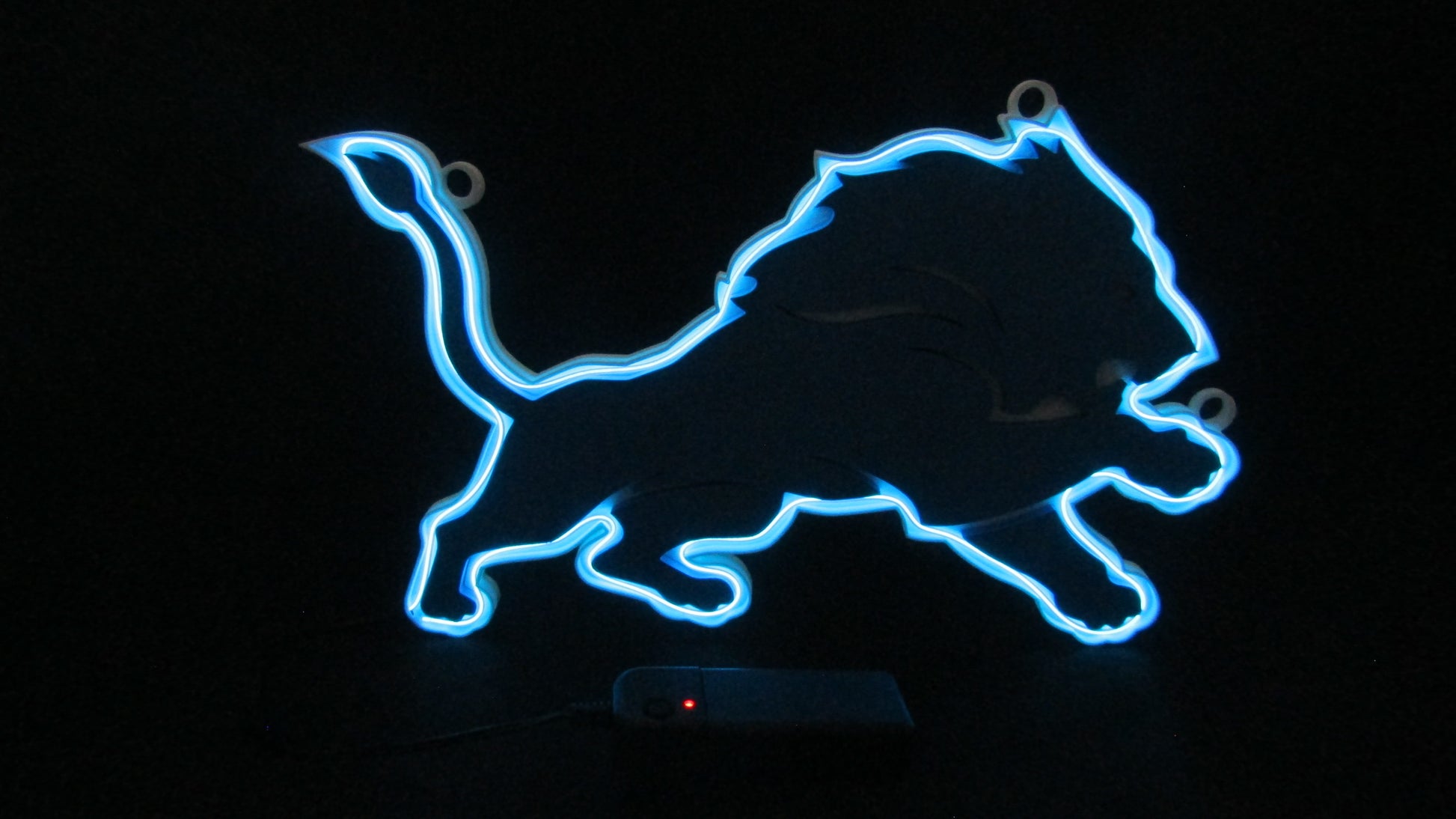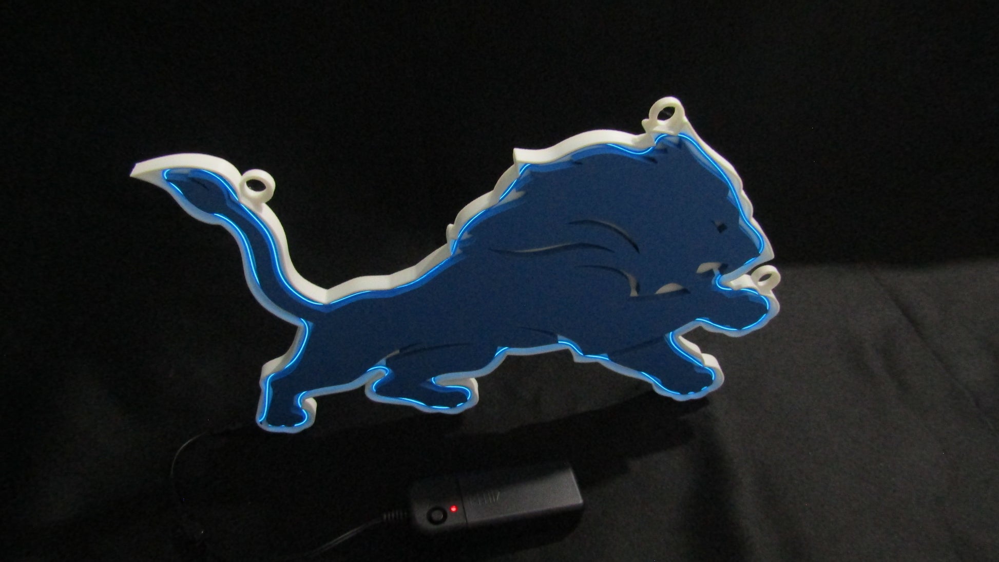Add bold, eye-catching style to any space with this 3D-printed LED Lion Sign. Designed with a striking lion silhouette and outlined in glowing blue LED lighting, this piece looks impressive both day and night. Use it as a freestanding display on a shelf or desk, or hang it on the wall using the built-in mounting loops.