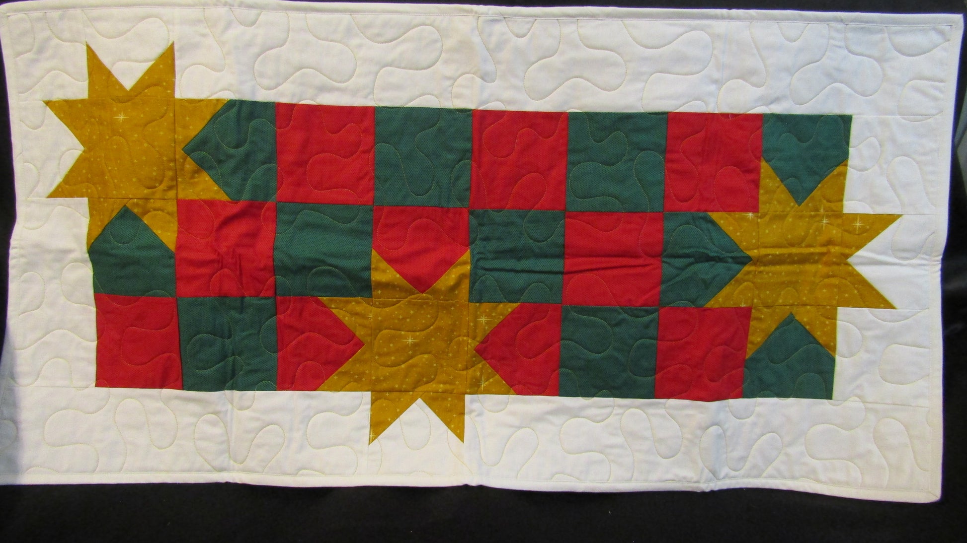 Dress up your table with this red, green and gold table runner. Table runner size is 22x44