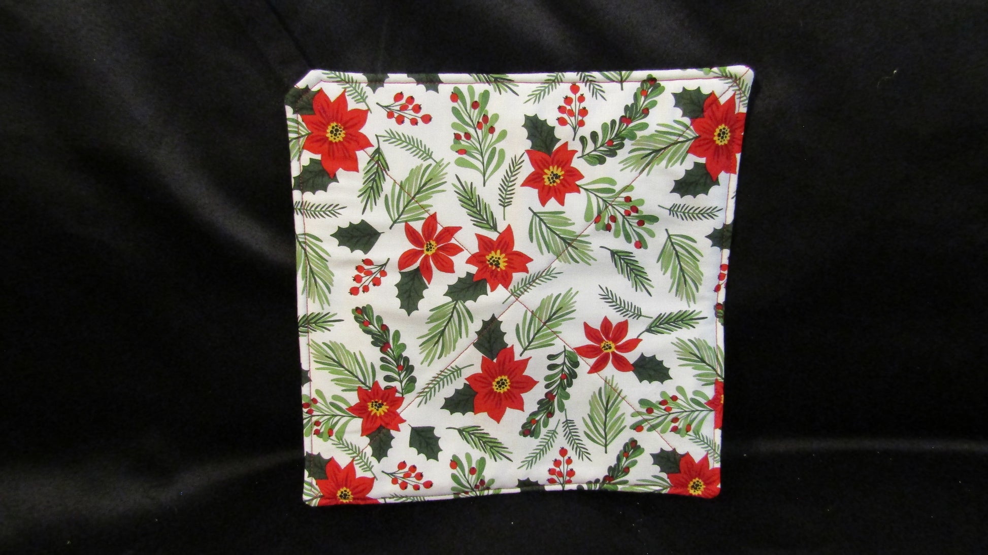 These pot holders are made with 100% cotton materials along with insul-bright material to help keep you from burning your hands when removing hot dishes from the oven. Size is 9x9.