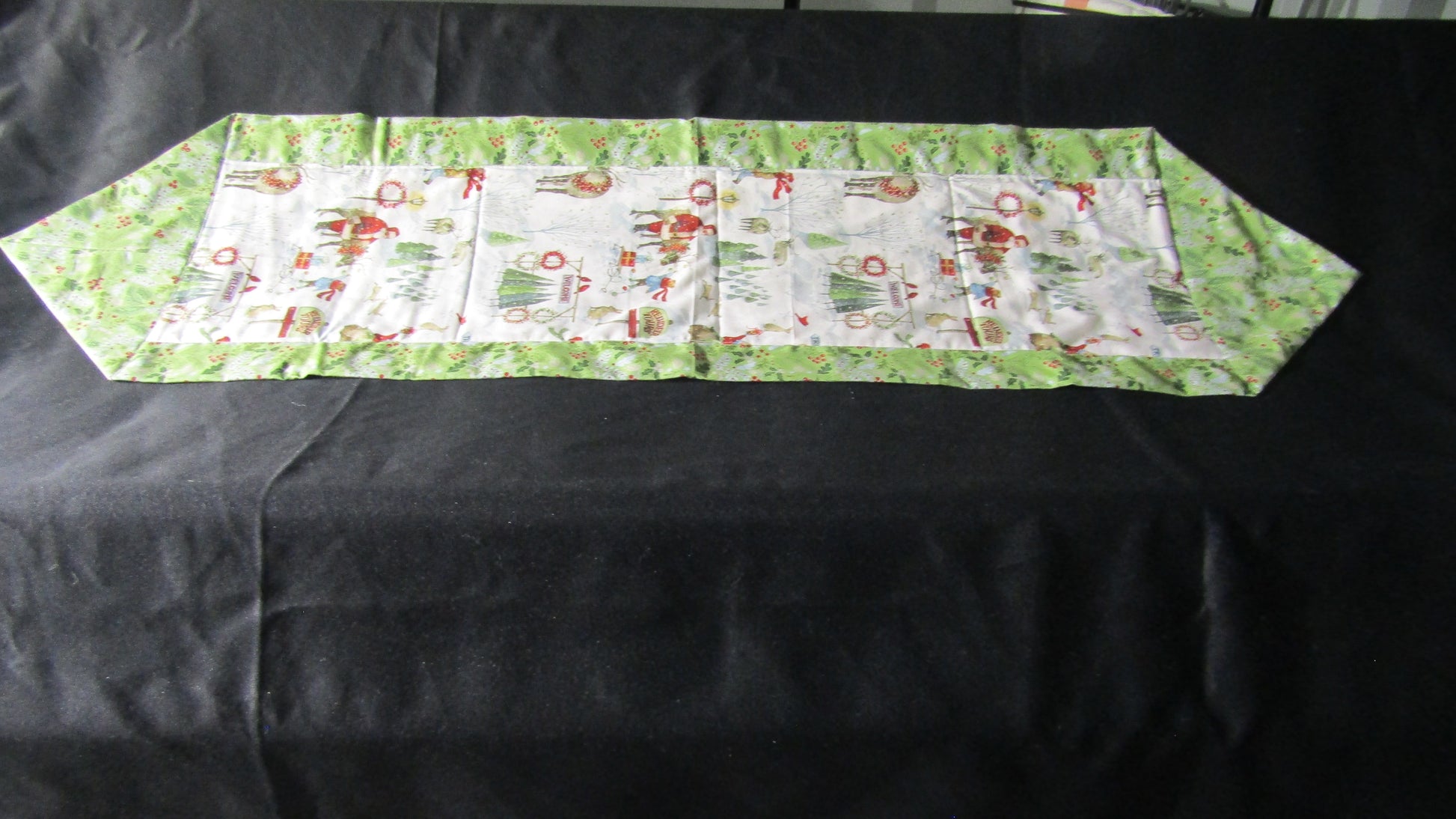 Bring a touch of holiday magic to your home with this festive handmade table runner. The design showcases a charming winter scene with Santa, reindeer, and woodland animals, framed by a cheerful green holly and berry border. It’s a beautiful way to add warmth and whimsy to your Christmas décor.